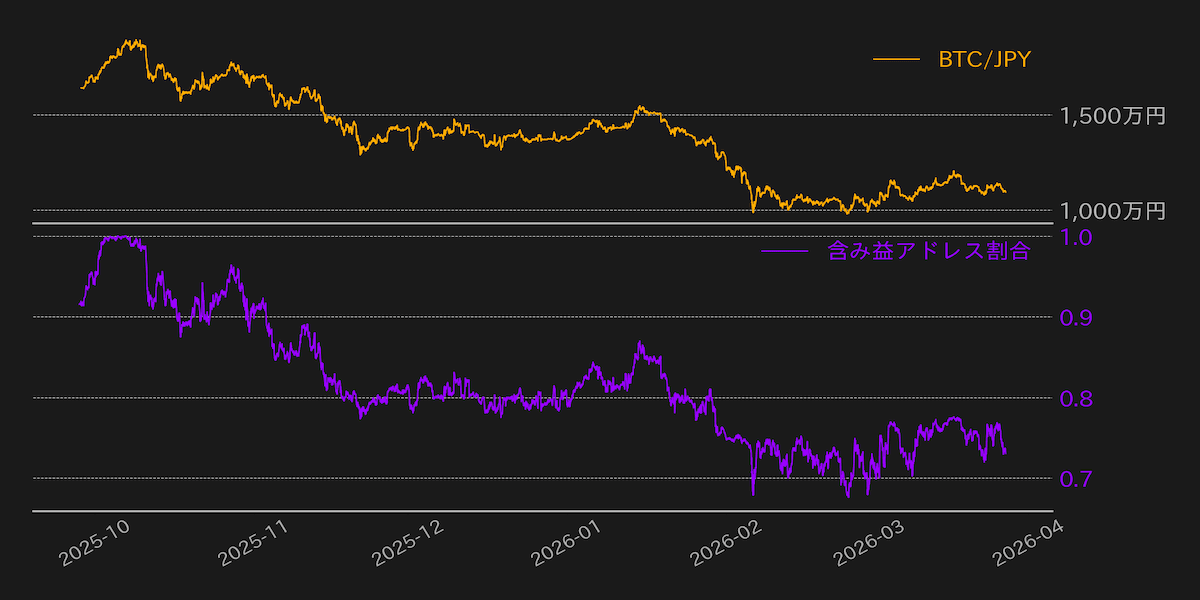 - ビットコインで含み益が出ているアドレスの割合は現在75%ほどで推移しています。今年1月から2月の下落時には80%台から70%を維持し割り込む動きがありました。相場は高値から45%ほど下落していますが、まだ多くのアドレスで利益が出ている状態を示しています。多くの投資家が利益を出していることから、下落トレンドの底を示唆する総悲観にはまだ調整が必要と言えるでしょう。