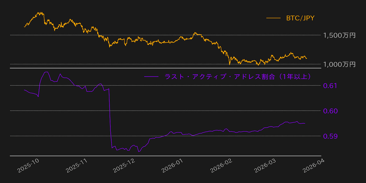 - 同指標は、1年以上送金がないビットコインアドレスの割合を示しています。4年サイクルの終盤では同指標が大きく上昇し、短期的なアドレスの動きが減少する傾向にあります。多くの投資家がビットコインを長期で放置する無関心相場が長く続くと、相場が底を打つと考えられます。現在はやや上昇傾向にあるものの、過去のサイクルの底と比べると、まだまだ上昇幅は少ない状況です。相場の底がまだ先であることを示唆しています。