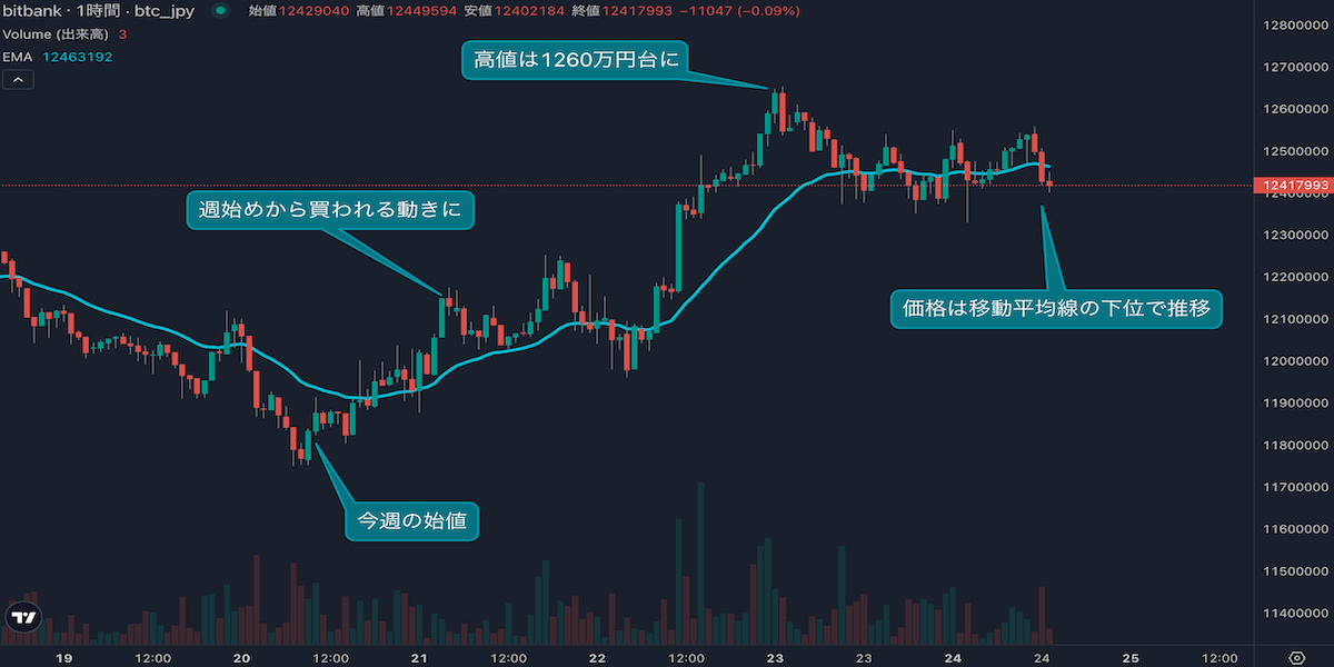 - 今週のビットコインは4月20日の1176万円から取引が始まりました。先週末に価格が下落した反動から、今週は取引開始から買われる動きとなりました。月曜日から木曜日まで上昇し、高値は1265万円を記録しました。ここ2カ月間の高値を更新しました。本日は高値警戒感から価格は24時間移動平均線(24EMA)を下回り、1240万円近辺で取引されています。今週も週足がプラスとなると4週連続の陽線を記録することになります。ビットコイン相場には底堅い動きが戻ってきていますが、週末はイラン情勢のニュースで売られやすいため警戒が必要です。