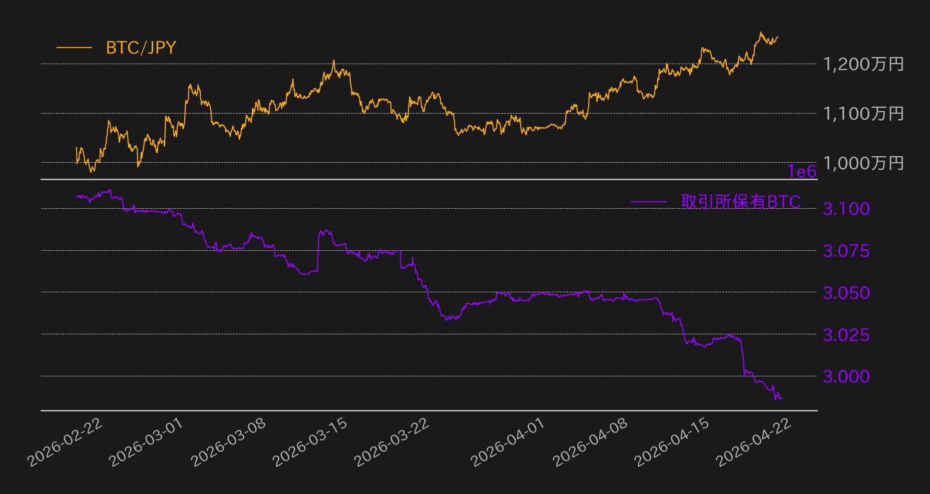 - 今週のビットコインは、先週末の下落から反発し、週半ばにかけて1265万円まで上昇しました。週足では4週連続の陽線となる可能性があり、相場には底堅さが戻りつつあります。一方、無期限先物の資金調達率や先物価格乖離率は低水準で推移しており、過度なレバレッジによる買いは見られません。取引所保有BTCの減少も売り圧力の低下を示唆していますが、週末はイラン情勢を巡るニュースで売られやすい地合いとなる可能性があり、短期的な下落には警戒が必要です。