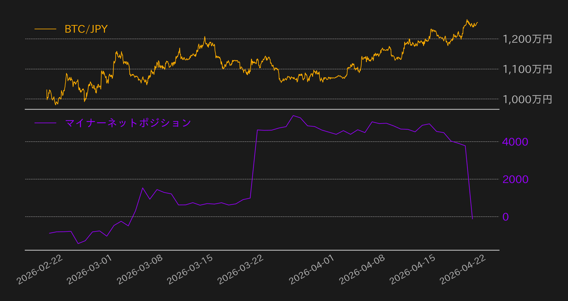 ビットコインの無期限先物取引における資金調達率(FR)は、足元でマイナスで推移しています。4月に入り価格が上昇しているものの、無期限先物取引では買いが弱い状況です。レバレッジのロングを控える動きがみられ、トレーダーの慎重姿勢を示しています。