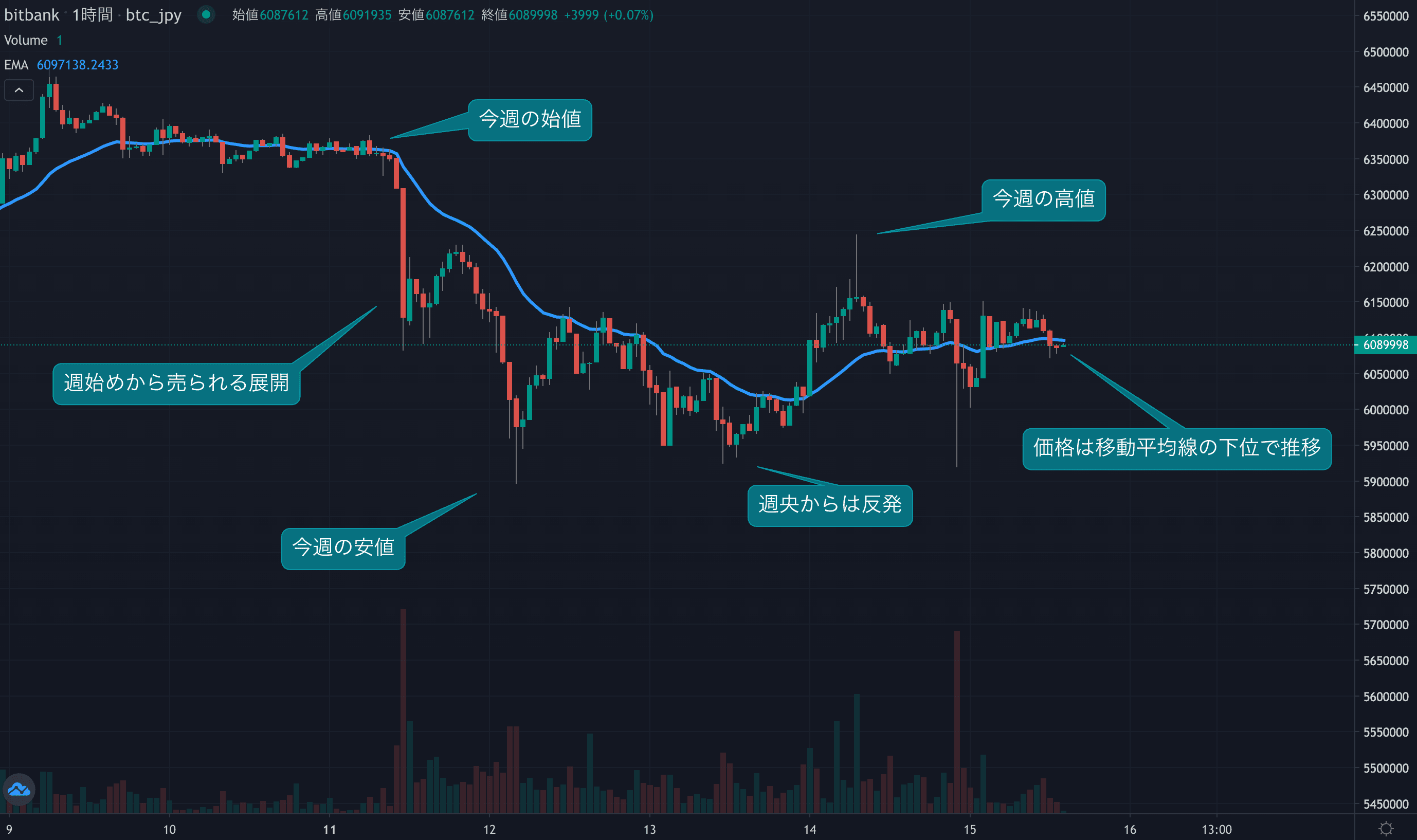 - 今週のビットコインは12月11日の635万円から取引が始まりました。相場は週明けの取引開始と共に売られる動きとなりました。日本時間に610万円まで下落したところで、一旦は下げ止まるもアメリカ時間に再度下落しました。価格は590万円近辺まで下落し、今週の安値となりました。週央に入ると相場は徐々に持ち直し、底堅い推移へと移行し始めます。水曜日には620万円台を回復したところで、反発に対する戻りが発生しました。現在は608万円で推移し、24時間移動平均線を僅かに下回った水準です。現在の水準が維持されると3週ぶりの週足陰線となります。価格は600万円近辺にサポートがあり、次の動きを待っている状態です。