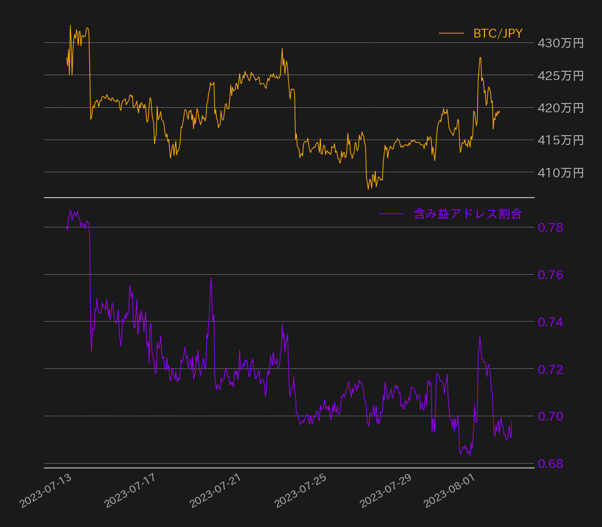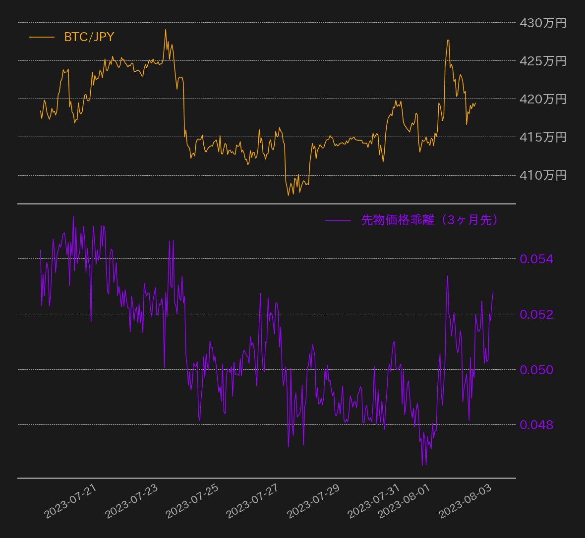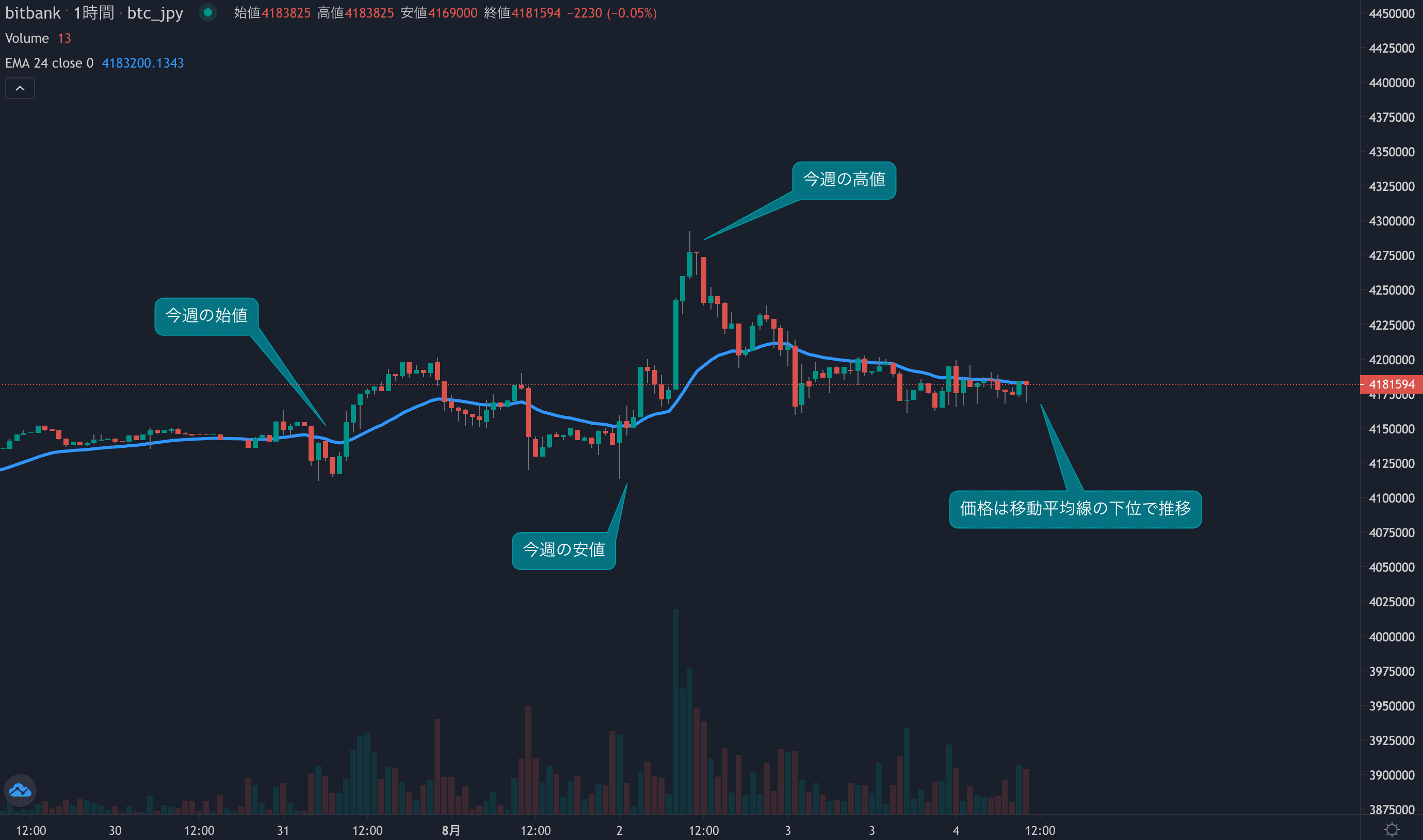 - 今週のビットコインは7月31日の412万円から取引が始まりました。週始めは底堅い動きとなりました。火曜日には一時今週の始値近辺まで下落する場面がありましたが、即座に買い戻され反発。価格は429万円まで上昇しました。一方、水曜日以降は上値が重い展開となり、利益を確定する動きがみられました。2週前の高値430万円を更新することはできませんでした。週後半は横ばい推移が続いており、現在は24時間移動平均線を僅かに下回った水準で取引されています。