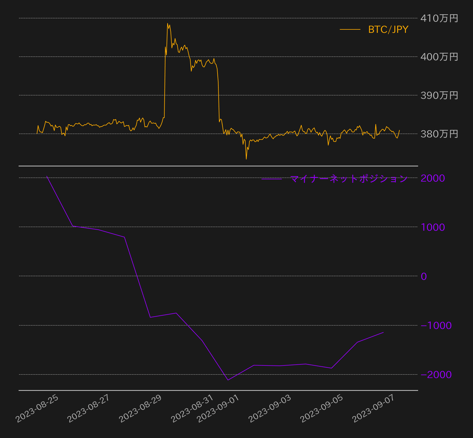 - 上記はマイナーのポジションの推移を表したものになります。同指標は7月から8月までプラスで推移することが多い状態でしたが、足元ではマイナスとなっています。マイナーがマイニングしたビットコインの一部を取引所などで売却しているため、マイナスを記録していると考えられます。マイナーからの売り圧力の上昇が継続するようだと、今後も上値が重くなる相場となるでしょう。