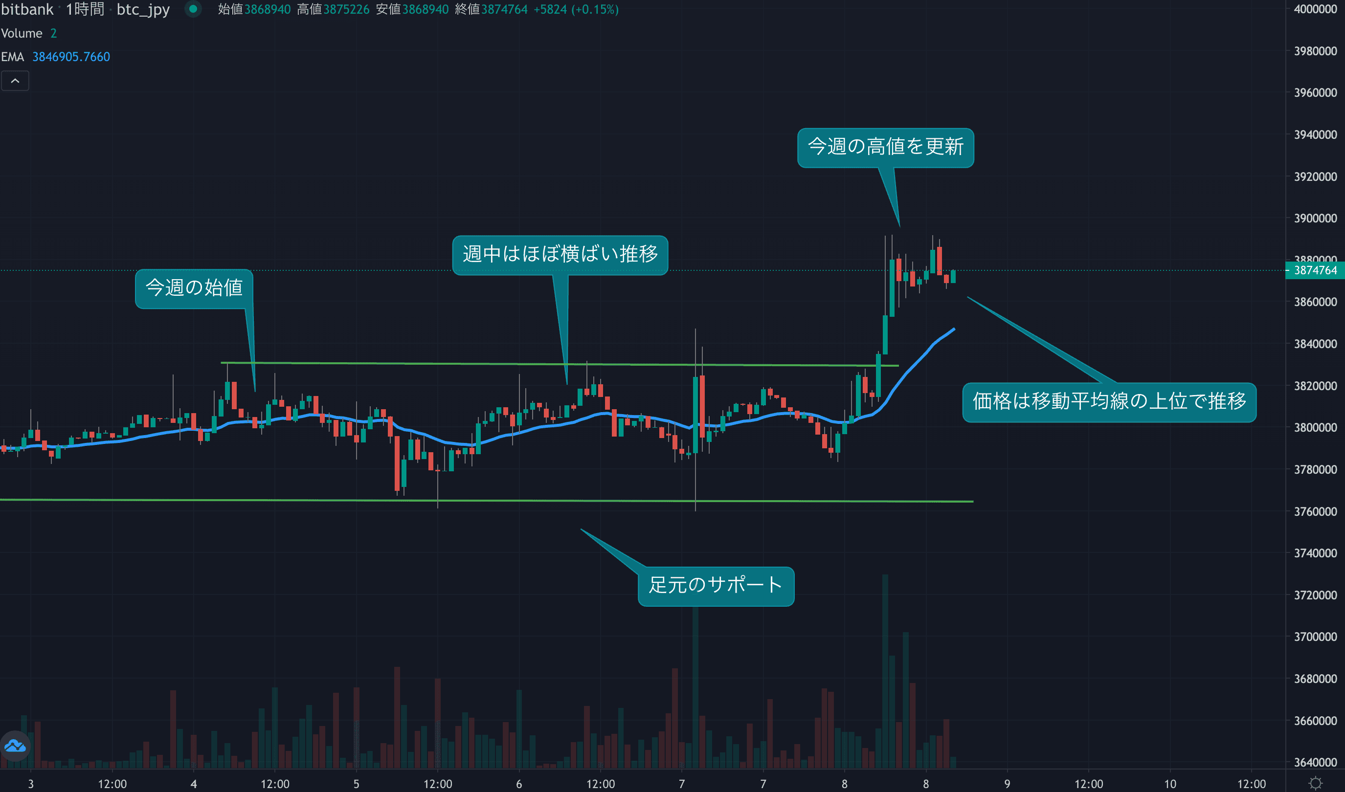 - 今週のビットコインは3月4日の380万円から取引が始まりました。週中は足元の安値である376万円を試す場面もありましたが、ほぼ横ばい推移でした。上値は382万円近辺で抑えられていました。一方、金曜日の朝方に今週の高値を更新し、387万円を記録しました。週足は1.8%の上昇となり、小幅ながら陽線となっています。これまで冴えない動きが続いていましたが、価格は現在、24時間移動平均線(24EMA)を上回り、底堅く推移しています。