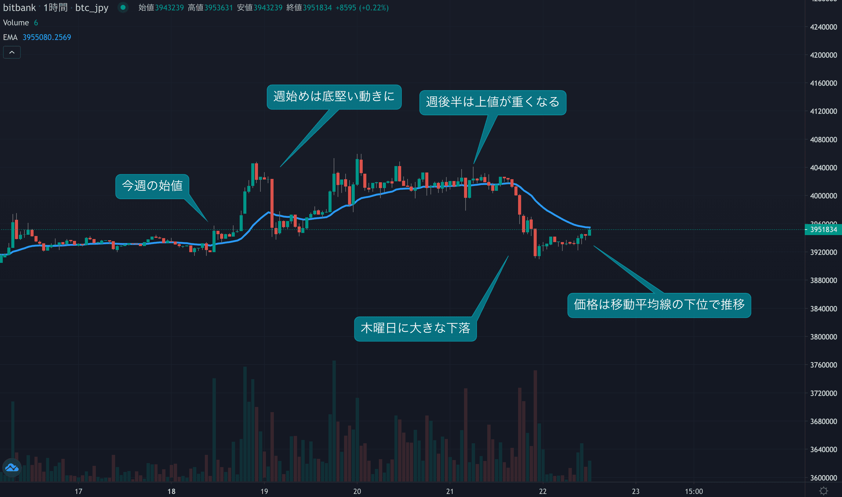 - 今週のビットコインは9月18日の392万円から取引が始まりました。今週は週始めから買われ、底堅い展開となりました。価格は週央に400万円台を回復し、約3週間ぶりの高値となりました。一方、400万円より上位では買いが続かず、上値が重くなりました。木曜日には利益確定の売りが発生し大きく下落。今週の上昇分をかき消す結果となりました。価格は現在395万円で推移し、24時間移動平均線を下回っています。このまま移動平均線の下位が維持されれば、来週も弱気の値動きが予想されます。