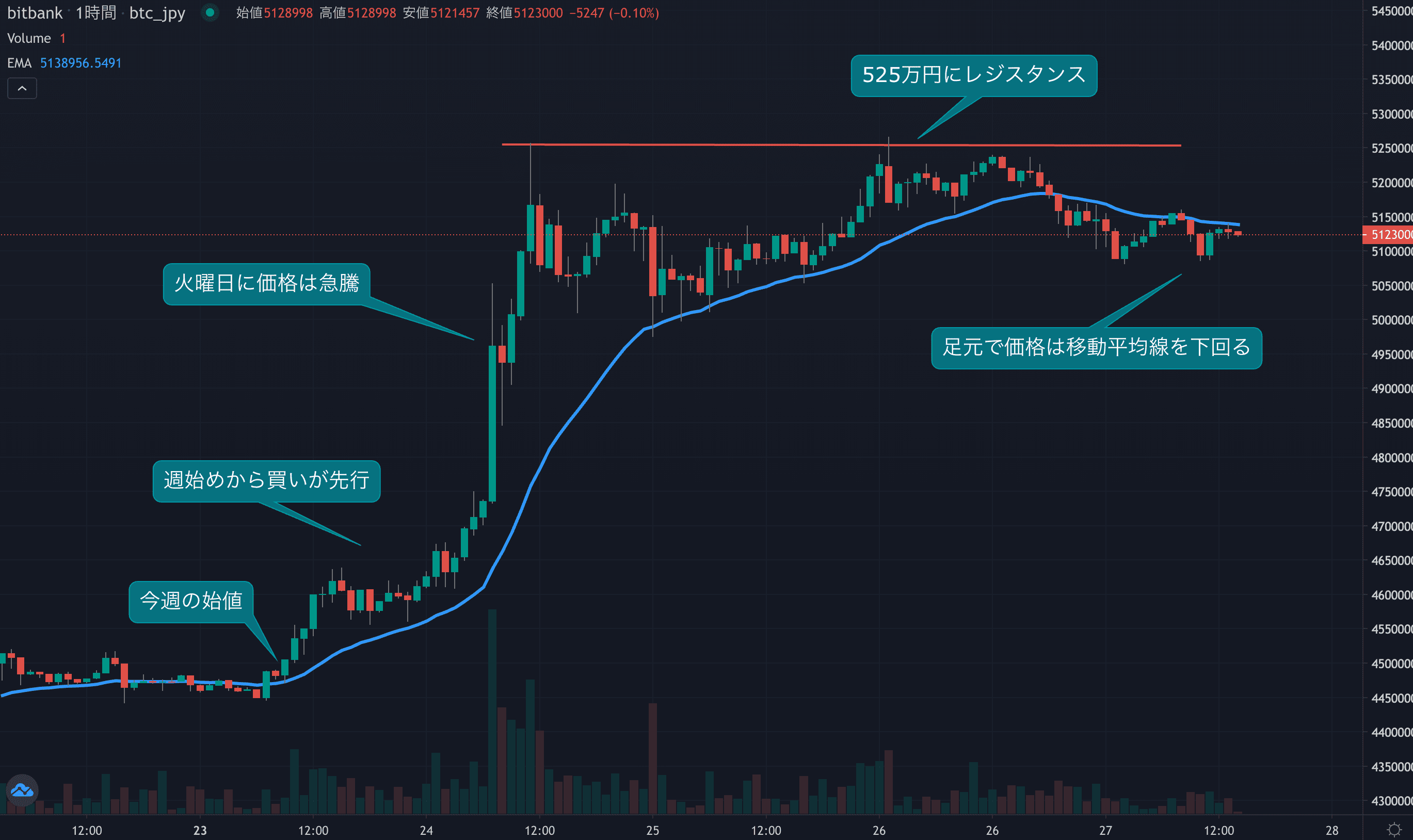 - 今週のビットコインは10月23日の448万円から取引が始まりました。週明け頃から24時間移動平均線(24EMA)を上回る動きがあり、買いが先行しました。価格は底堅い動きが続き、火曜日の朝方に急騰し、価格は年初来高値を更新しました。一時525万円にタッチしたところで徐々に上値が重くなりました。週後半にかけて短期的な利確売りが発生し、現在は512万円台で推移しています。足元では24EMAを下回った水準で推移しており、押す展開となっています。