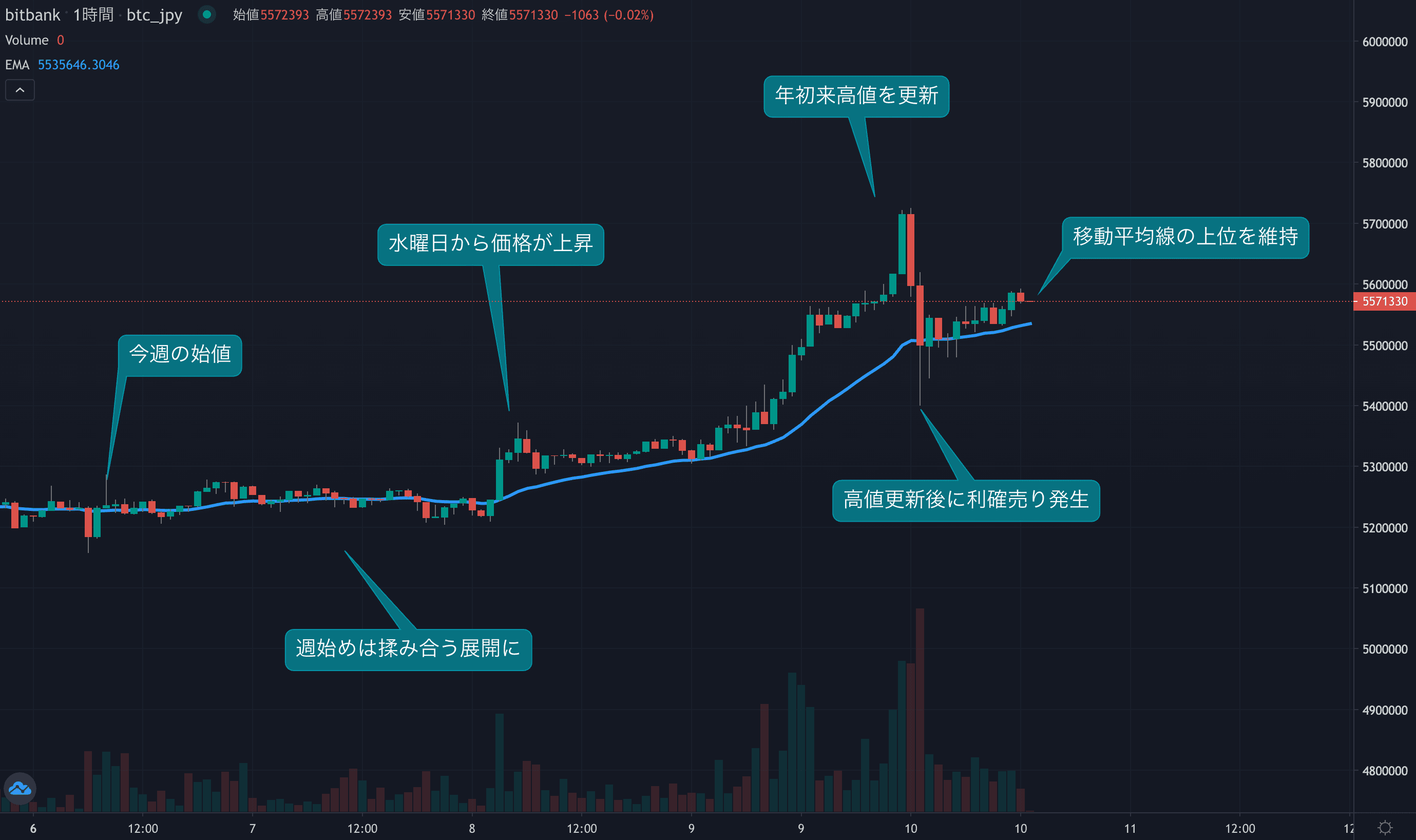 - 今週のビットコインは11月5日の523万円から取引が始まりました。週始めは揉み合う展開となり、24時間移動平均線(EMA)近辺で推移する動きでした。水曜日になると、再度買われ始め価格が上昇し始めました。木曜日の夜には年初来高値となる572万円まで上昇。高値を記録した後に利確売りが発生し、540万円まで下落する動きもありました。一方、現在は再び底堅い動きとなり24EMAの上位で推移しています。今週は高値圏では強い売りもみられましたが、まだ買いが先行している相場となりました。