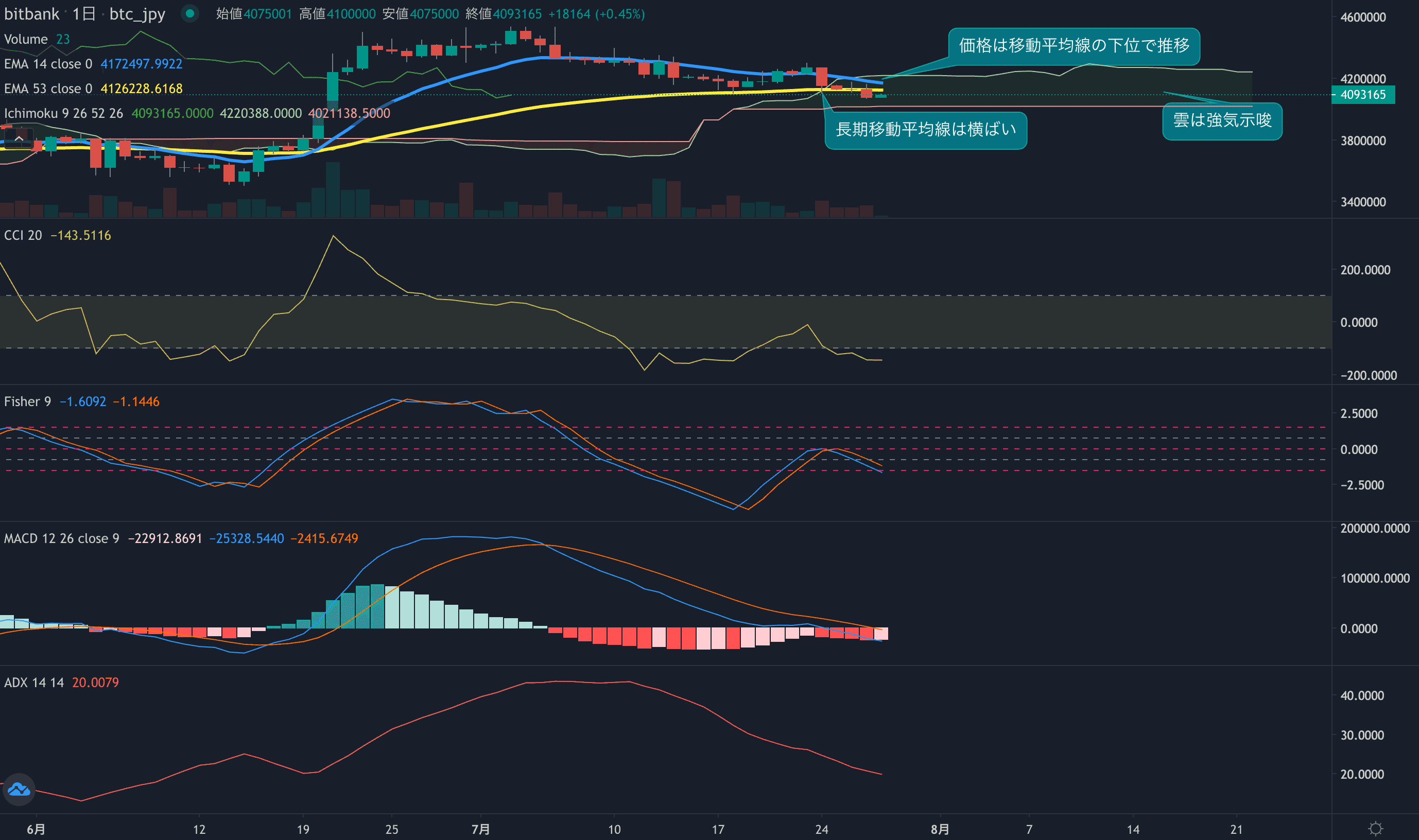 - オシレーターは下落傾向となっています。CCIは-142まで下落しています。Fisherはマイナスで遅行線を下回り推移。MACDも今週は、マイナスで推移し始めています。