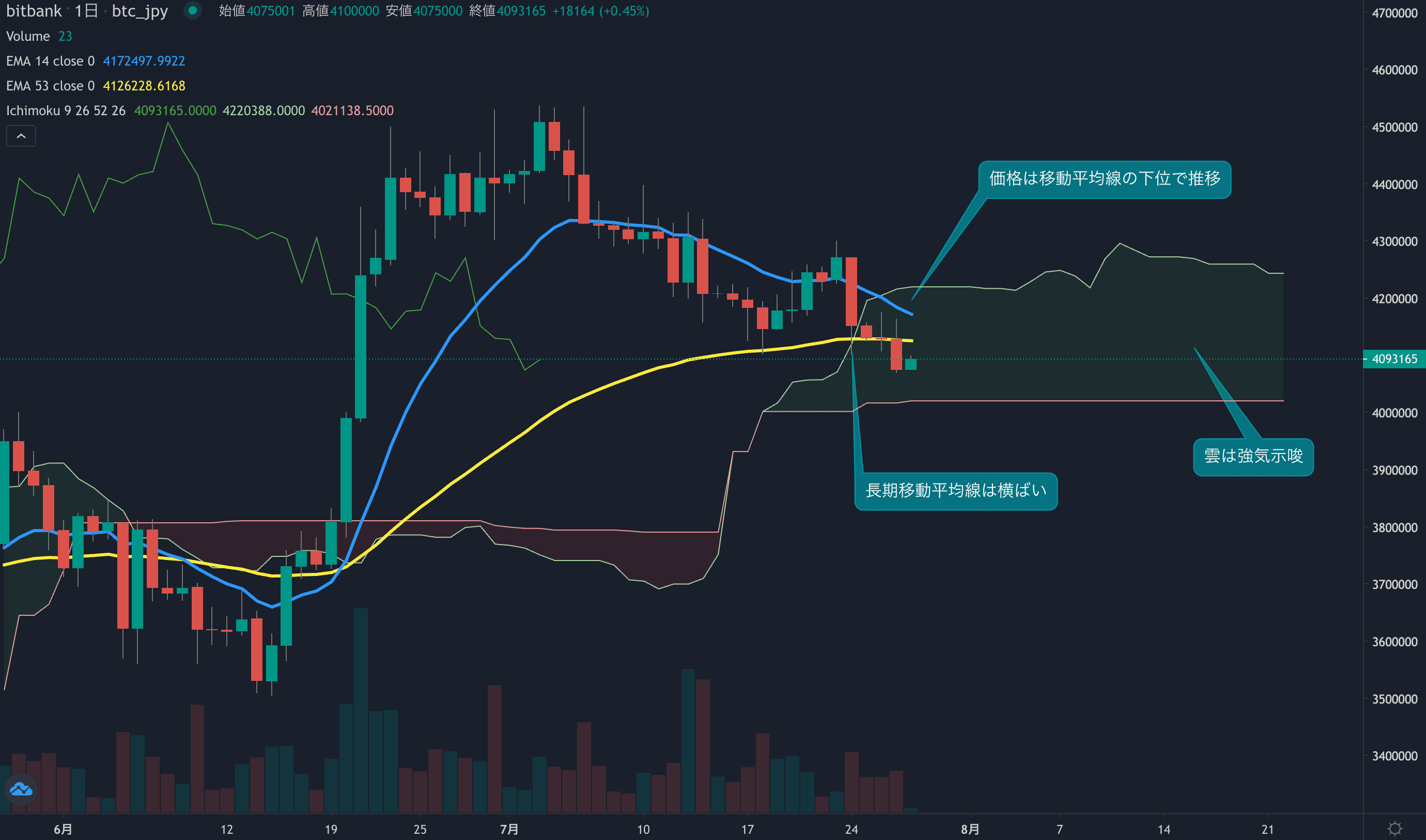 価格は14EMA(418.4万円)を下回り弱気示唆です。53EMA(412.7万円)は横ばい推移で長期トレンドは中立です。一目均衡表の雲は先行スパン1(424.4万円)が先行スパン2(402.1万円)を上回り強気示唆です。