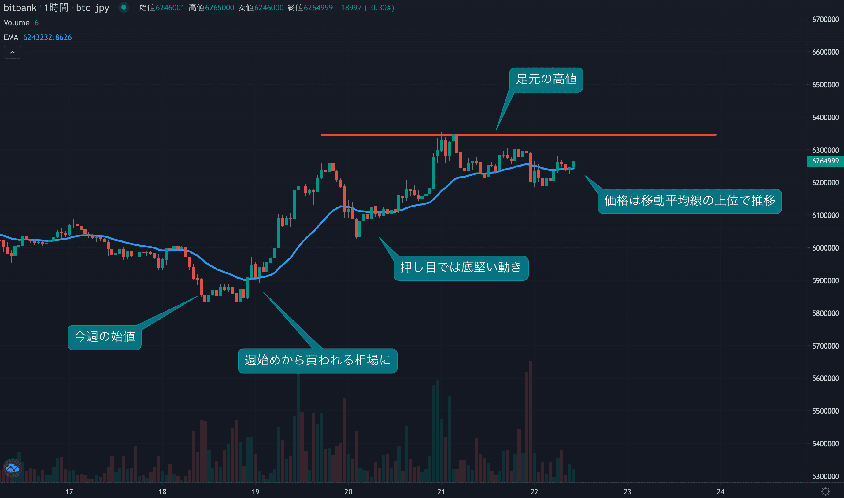 - 今週のビットコインは12月18日の590万円から取引が始まりました。今週は週始めから買われる動きとなり上昇しています。火曜日に相場が625万円まで上昇したところで、押し目を付ける動きとなりました。押し目ではしっかり買われ、再度上昇に転じました。木曜日には634万円まで上昇し、今週の高値となりました。現在も630万円台がレジスタンスとなり上値の重しとなっています。一方、相場は週後半に入っても底堅さを維持し、24時間移動平均線(24EMA)の上位で推移しています。足元では再度高値を試す展開となっています。このまま移動平均線の上位を維持できれば、高値の更新は時間の問題でしょう。